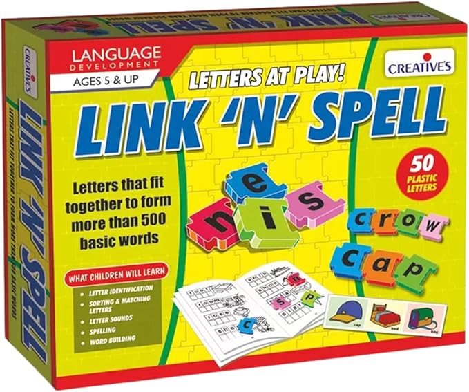Build early reading and spelling skills in a fun hands-on way with Creative’s Link N Spell. This educational word-building game helps kids practice letter identification, letter sounds, spelling, vocabulary, and phonics by linking colorful letter tiles together to form words. The product helps children build 500+ basic words, making it a strong screen-free learning toy for home or classroom use.