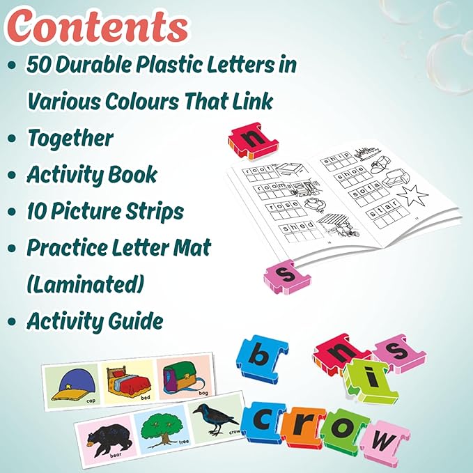 The set is designed for young learners and includes 50 durable linkable letters, 10 picture strips, a practice letter mat, and an activity book/activity guide for guided play and multiple learning activities.